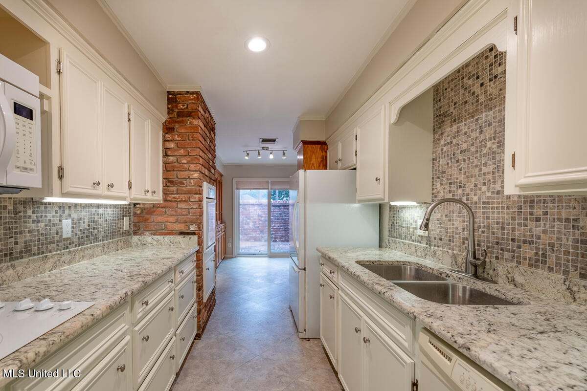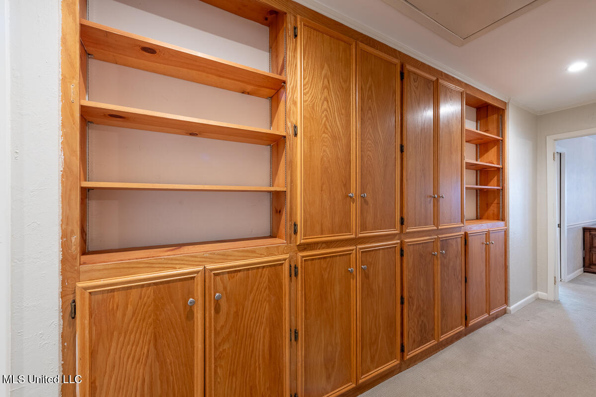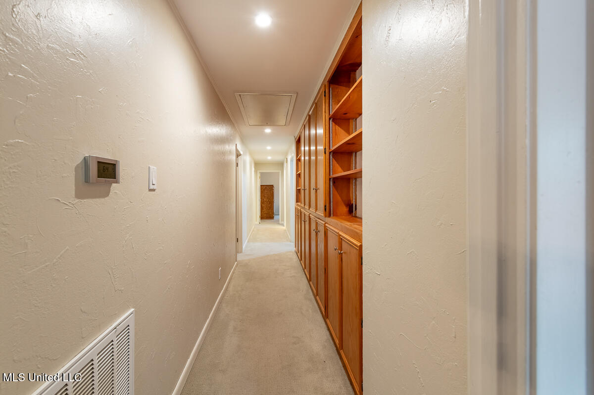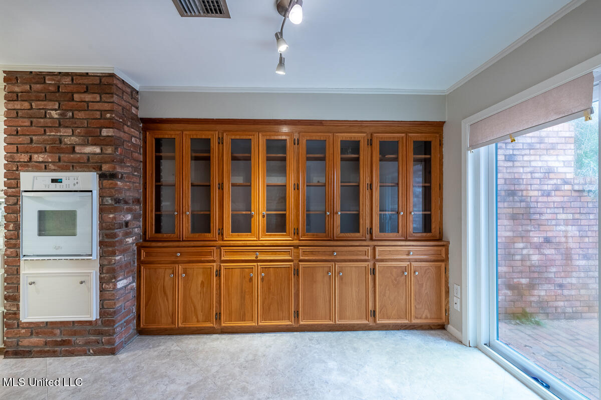 The kitchen features built-in cabinetry, freshly painted white cabinets, and a bright breakfast area overlooking the private front courtyard. The hallway offers additional built in bookshelves and storage cabinets for added functionality.