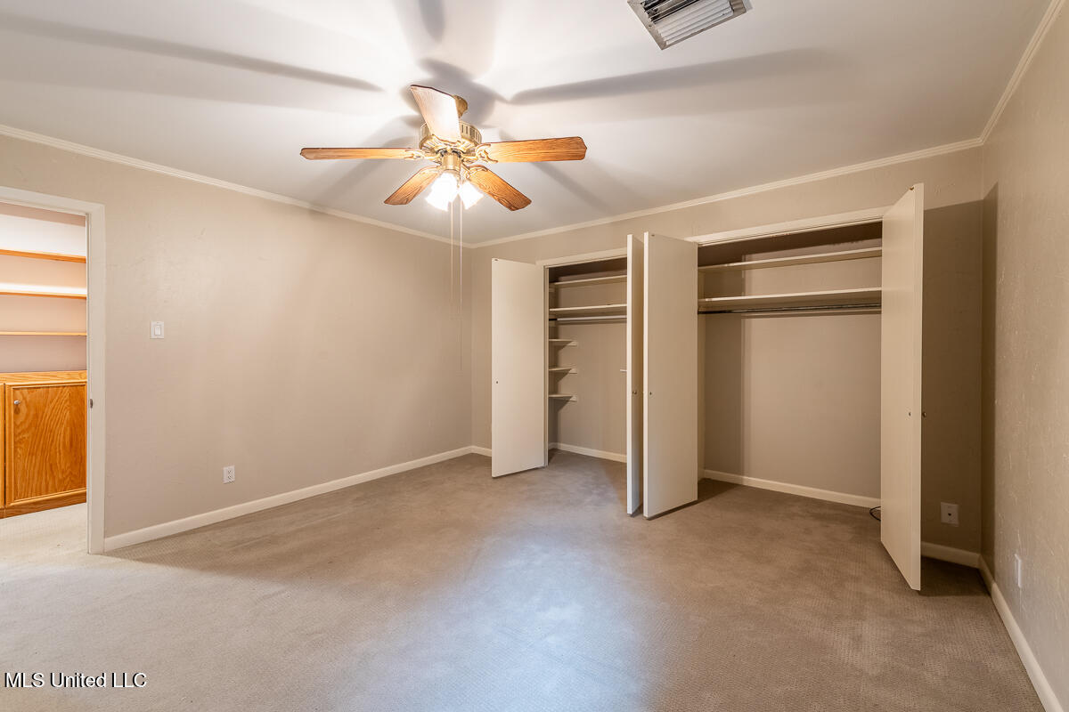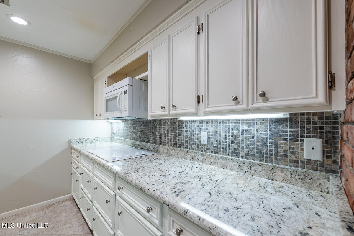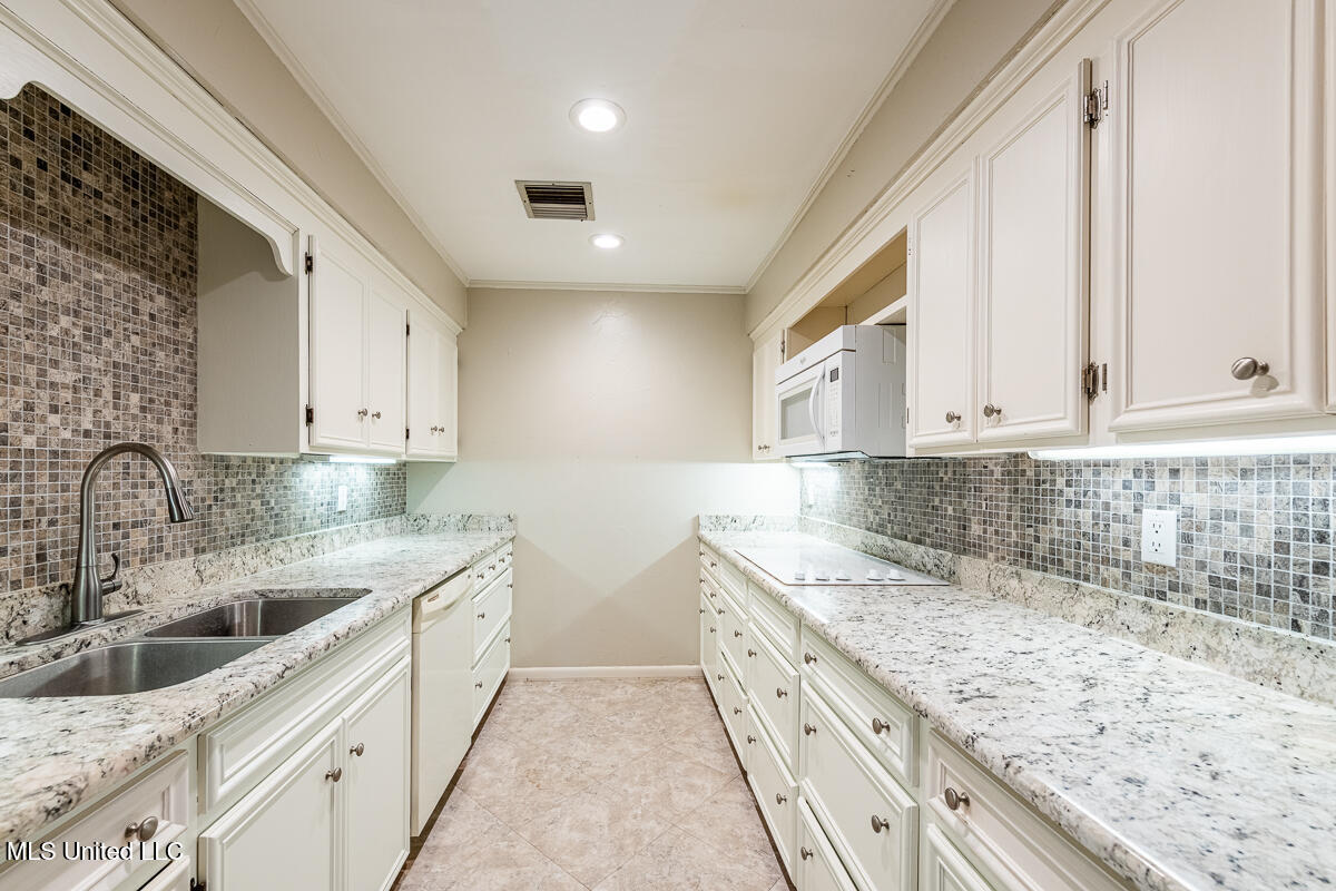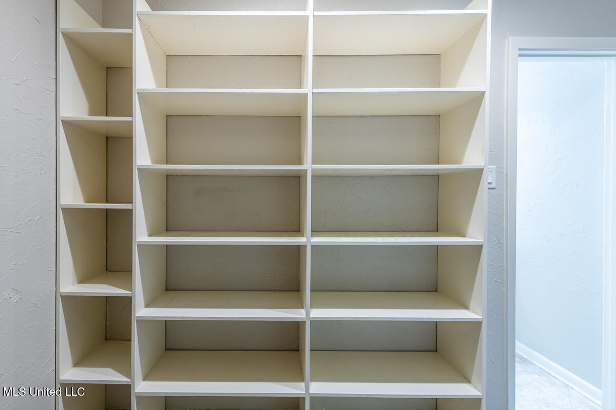 The kitchen features built-in cabinetry, freshly painted white cabinets, and a bright breakfast area overlooking the private front courtyard. The hallway offers additional built in bookshelves and storage cabinets for added functionality.