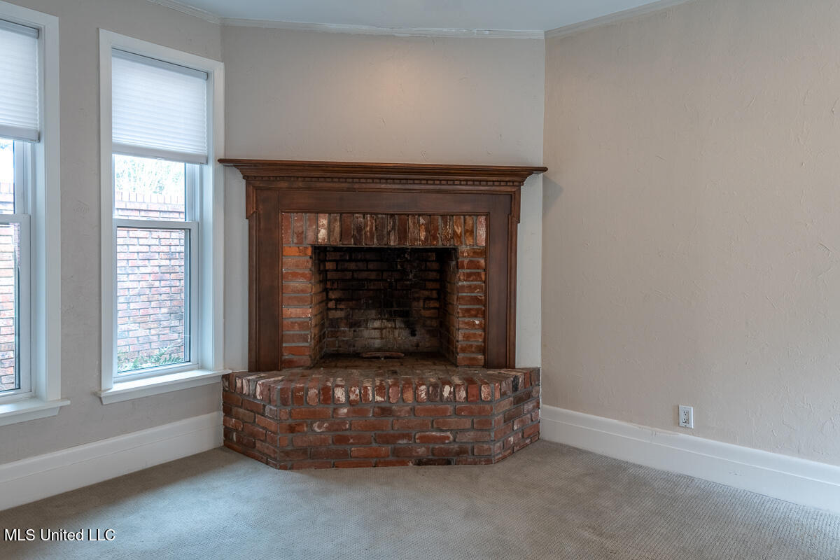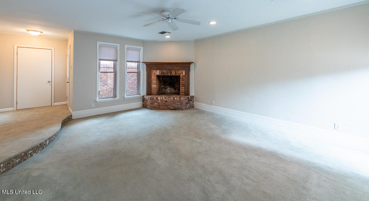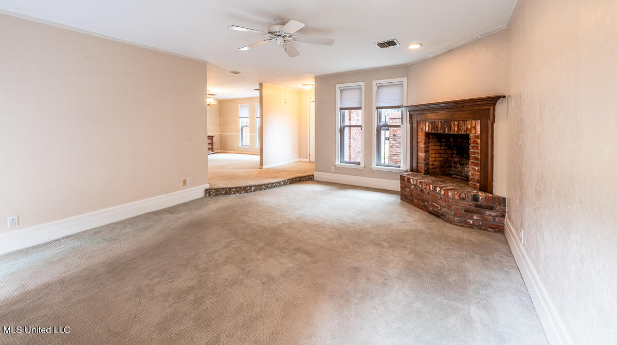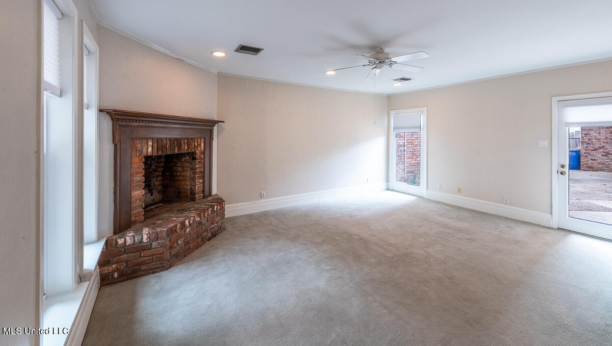The home includes a spacious den with a fireplace , brick hearth, and beautiful mantel, creating a warm and inviting living space..